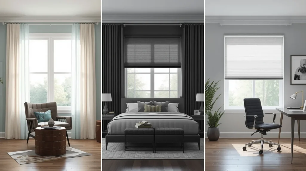 They also affect mood and comfort. Sheer curtains, for example, soften natural light and create a calm atmosphere. Blackout drapes, on the other hand, make bedrooms restful by blocking light and noise. Roller shades bring a clean and modern look, perfect for offices or minimal spaces.